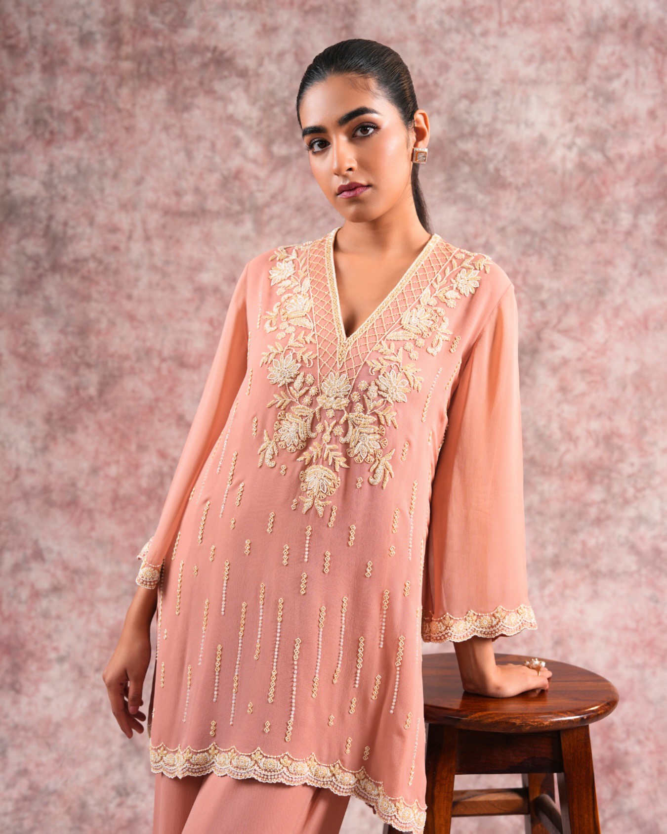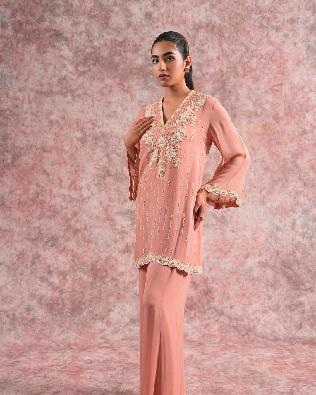 Elevate your ethnic charm with Blush Bloom by Femmora. This soft peach kurta set features intricate thread and sequin embroidery on the neckline, sleeves, and hem, perfectly paired with straight-fit pants. An elegant ensemble for festive gatherings, mehendi functions, or intimate celebrations. Fabric: Georgette Work: Embroidery with Sequin Detailing Sleeves: Flared full sleeves Fit: Semi-Stitched (Up to 42") Set Includes: Kurta + Pants