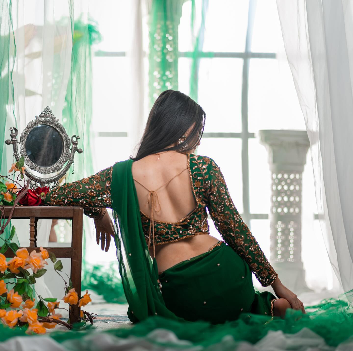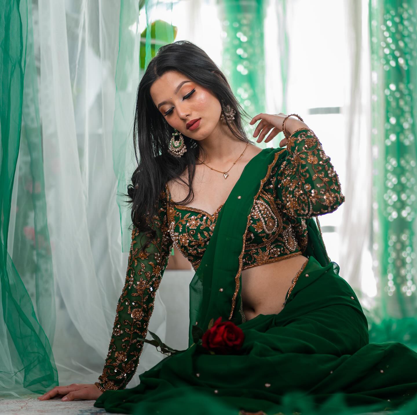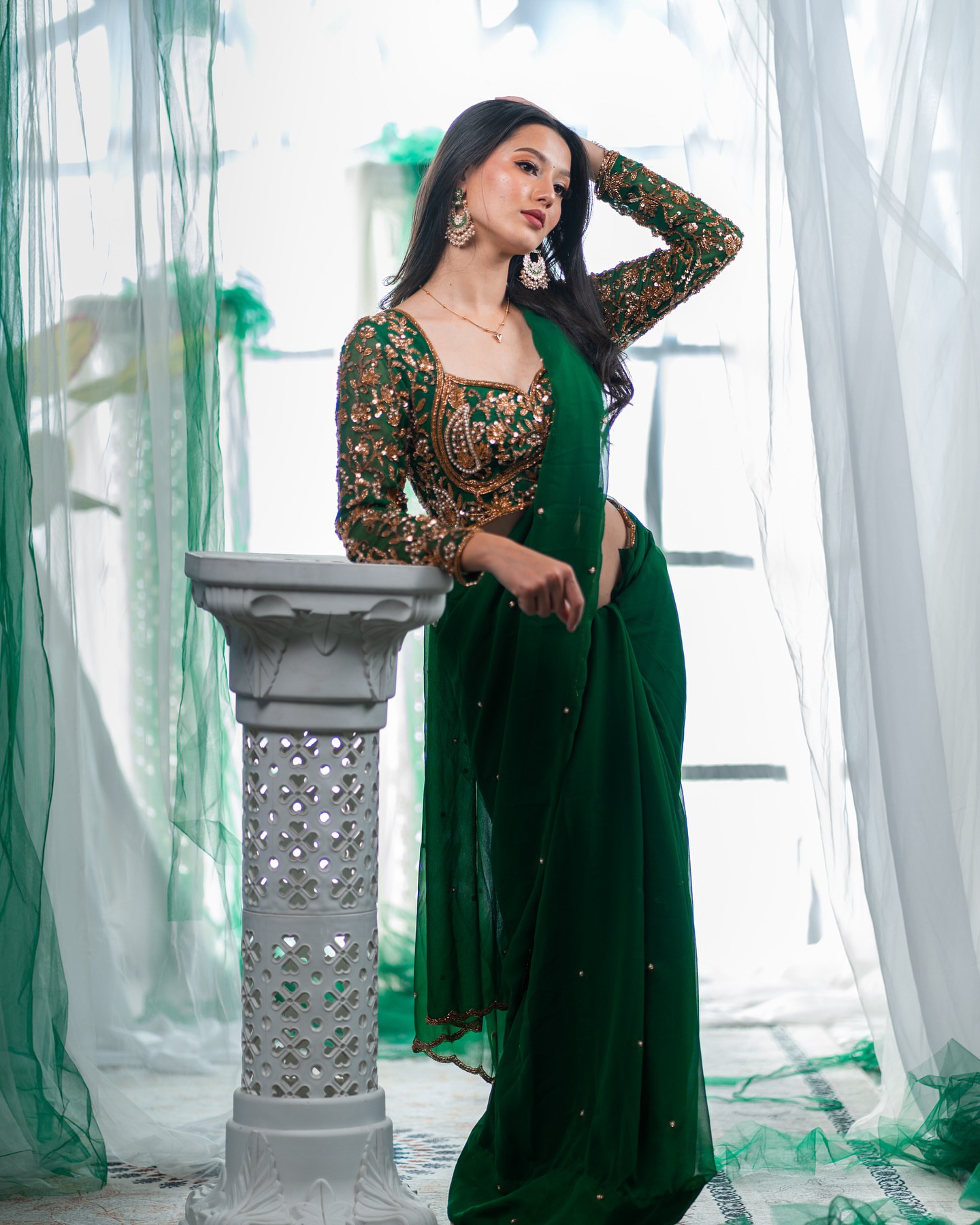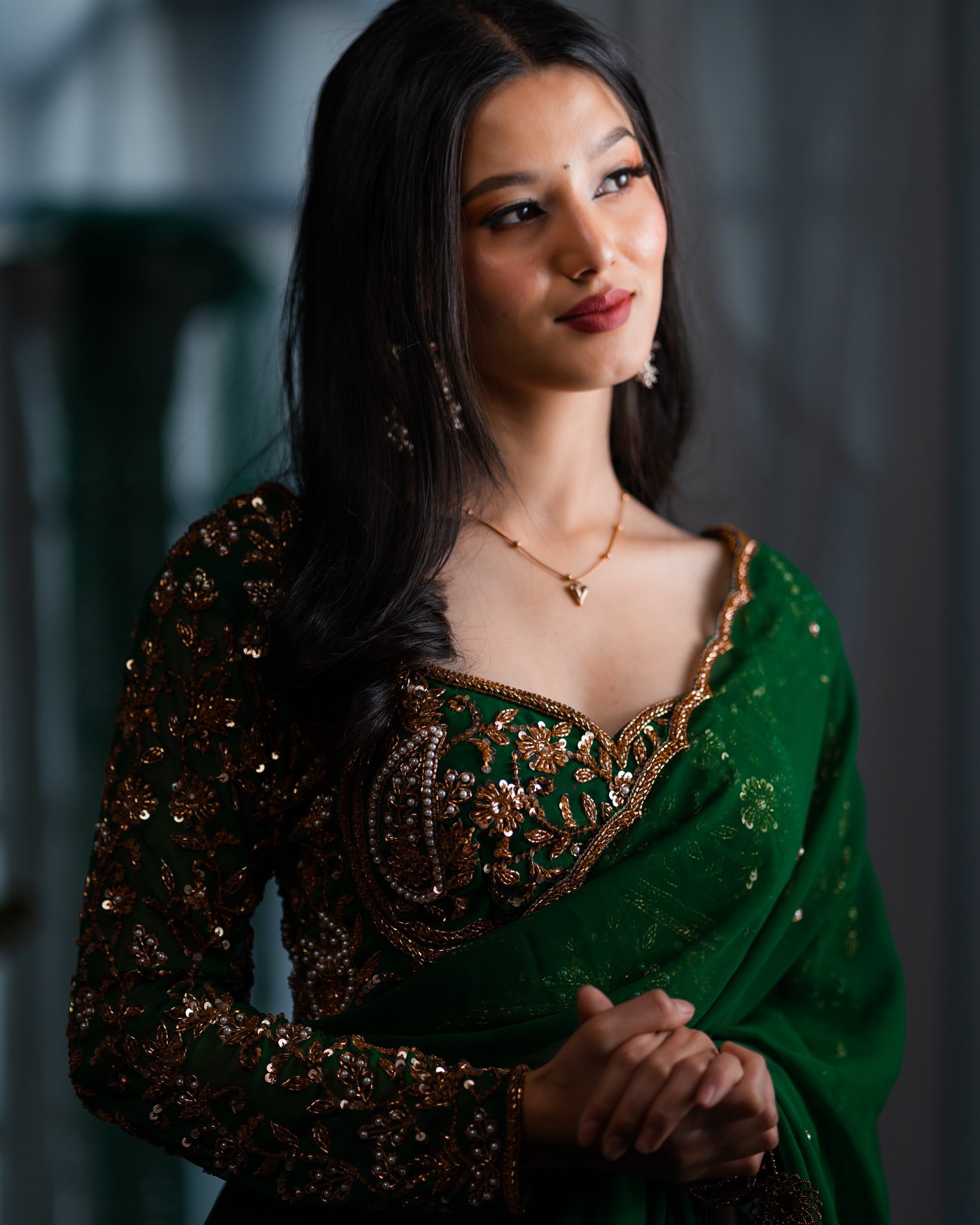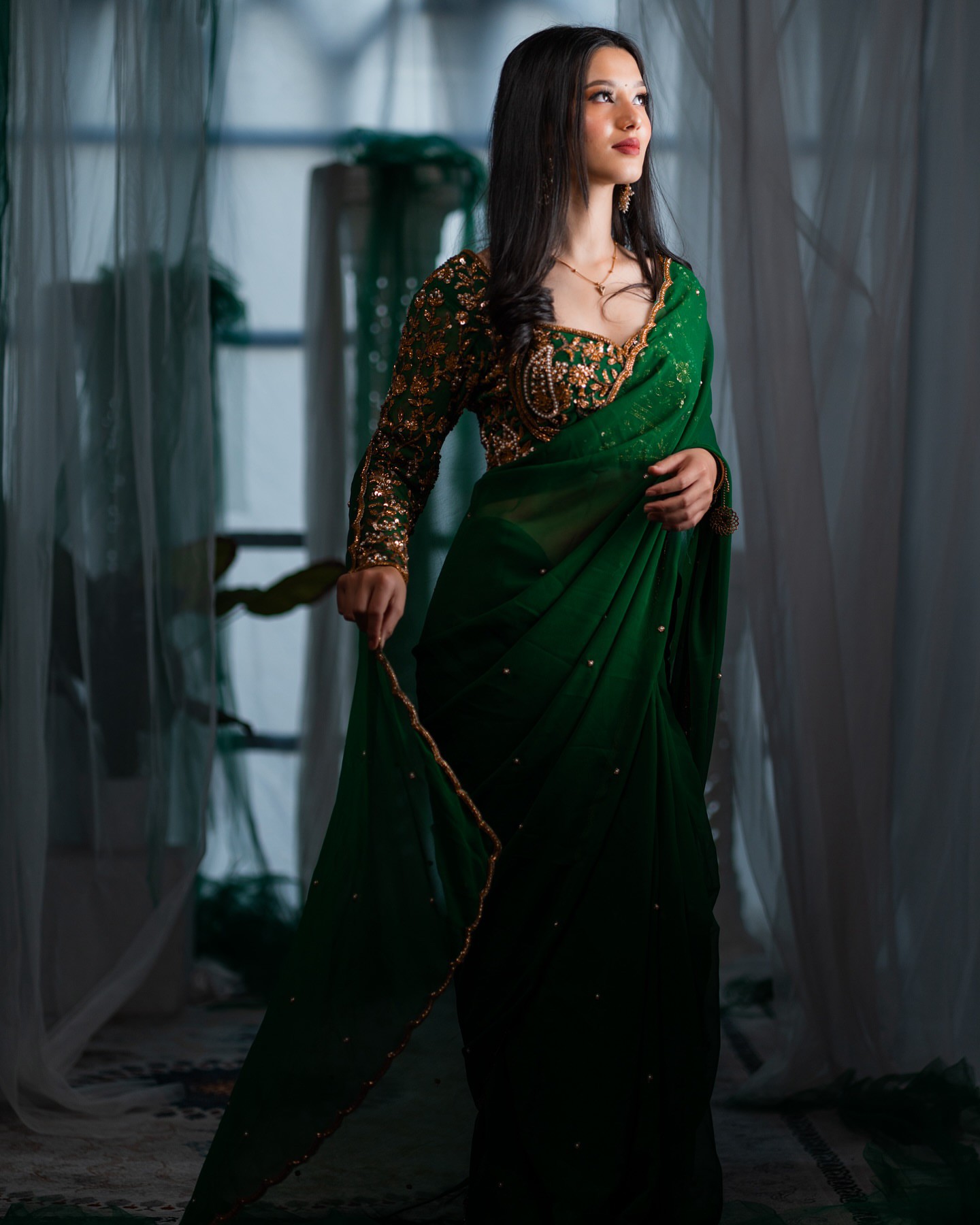 Elevate your festive and wedding wardrobe with this breathtaking emerald green saree set. The rich chiffon saree features delicate sequin detailing that adds a touch of sparkle to every movement. Paired with a fully hand-embroidered blouse adorned in golden zari and mirror work, this ensemble is a blend of regal charm and contemporary sophistication.