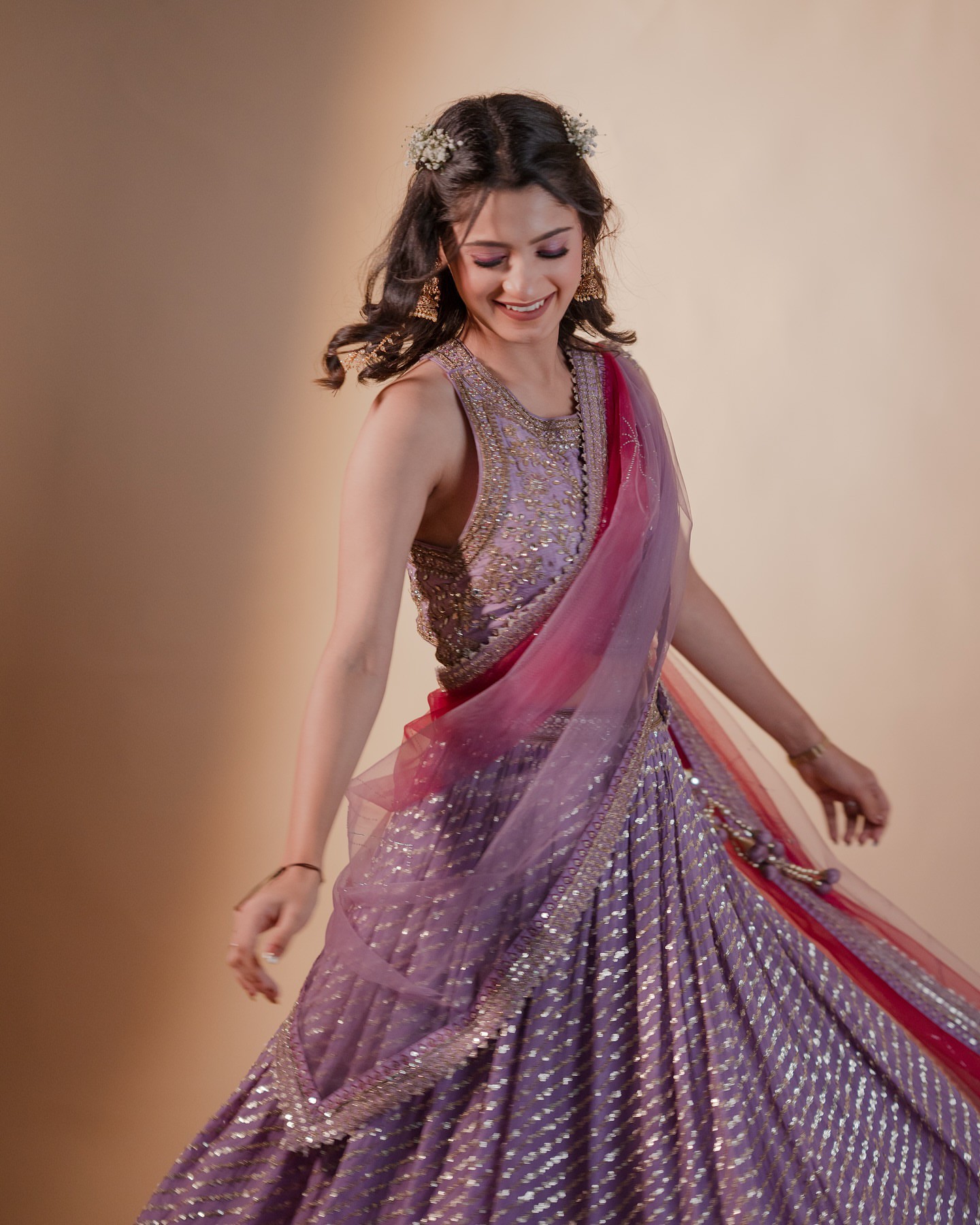Turn heads at your next celebration with this Lavender Sequin Embellished Lehenga Choli, designed for modern elegance and traditional charm. The shimmering silver sequin work dances with every twirl, while the hot pink net dupatta adds a vibrant pop of contrast.