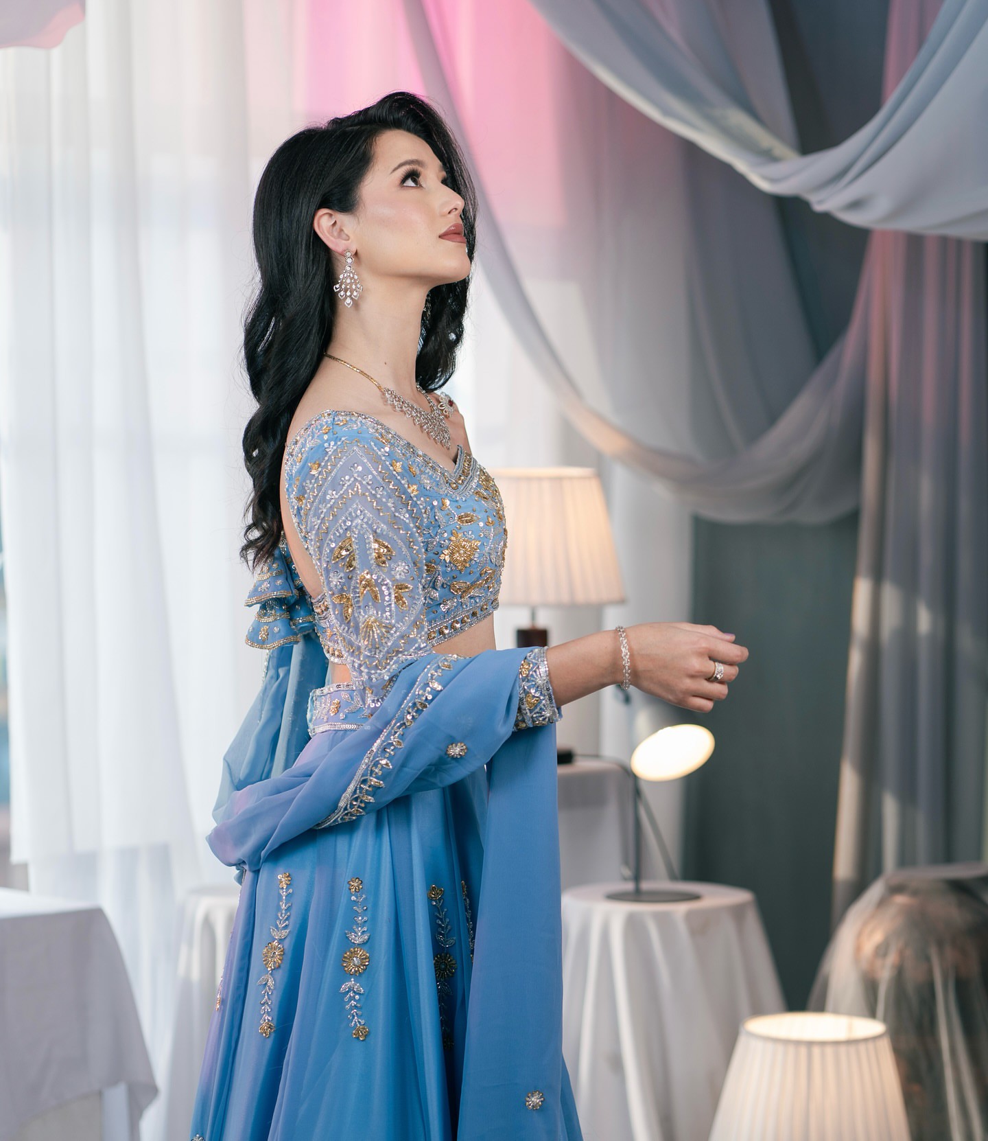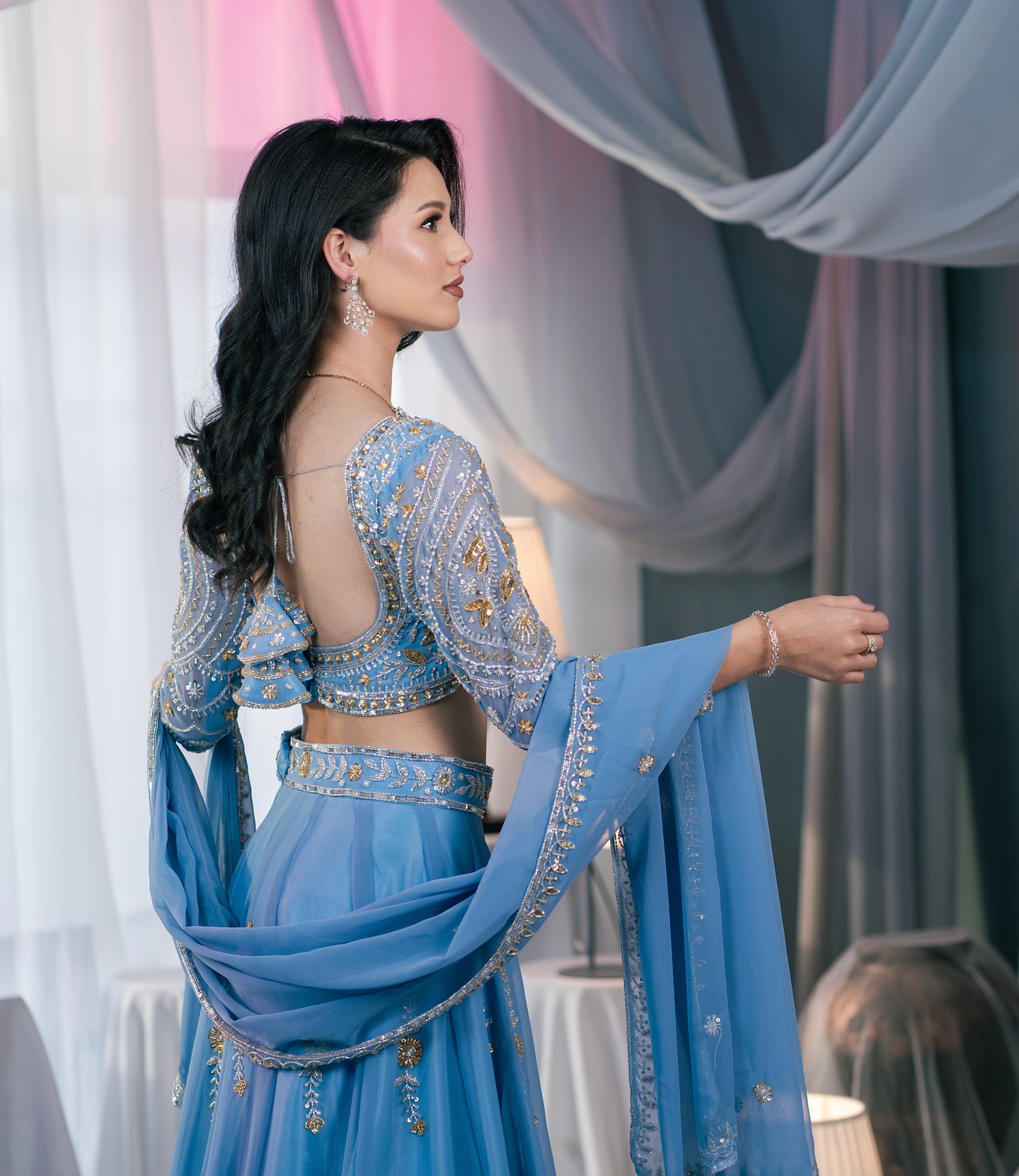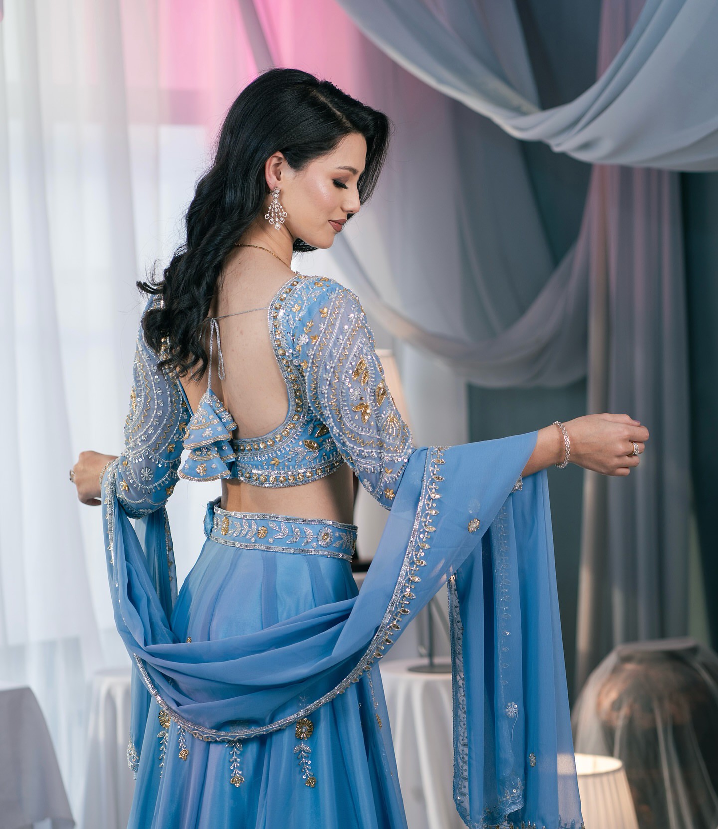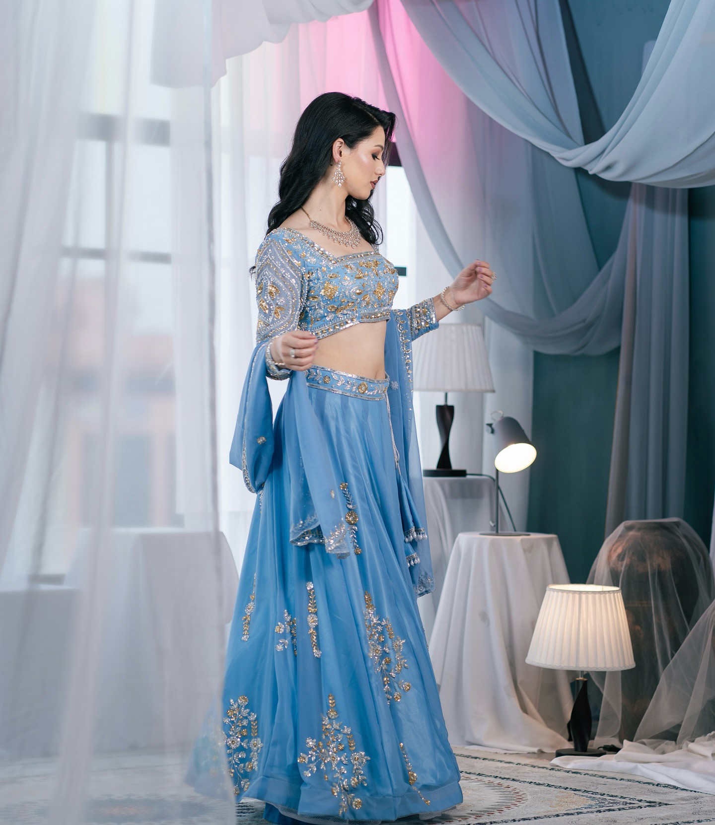 Step into elegance with this enchanting sky-blue lehenga set. The intricately embroidered blouse boasts gold and silver threadwork paired with sparkling sequins, while the flowy flared skirt is adorned with delicate floral motifs that add regal charm. The matching dupatta, edged with bead detailing, completes the look with grace and finesse.